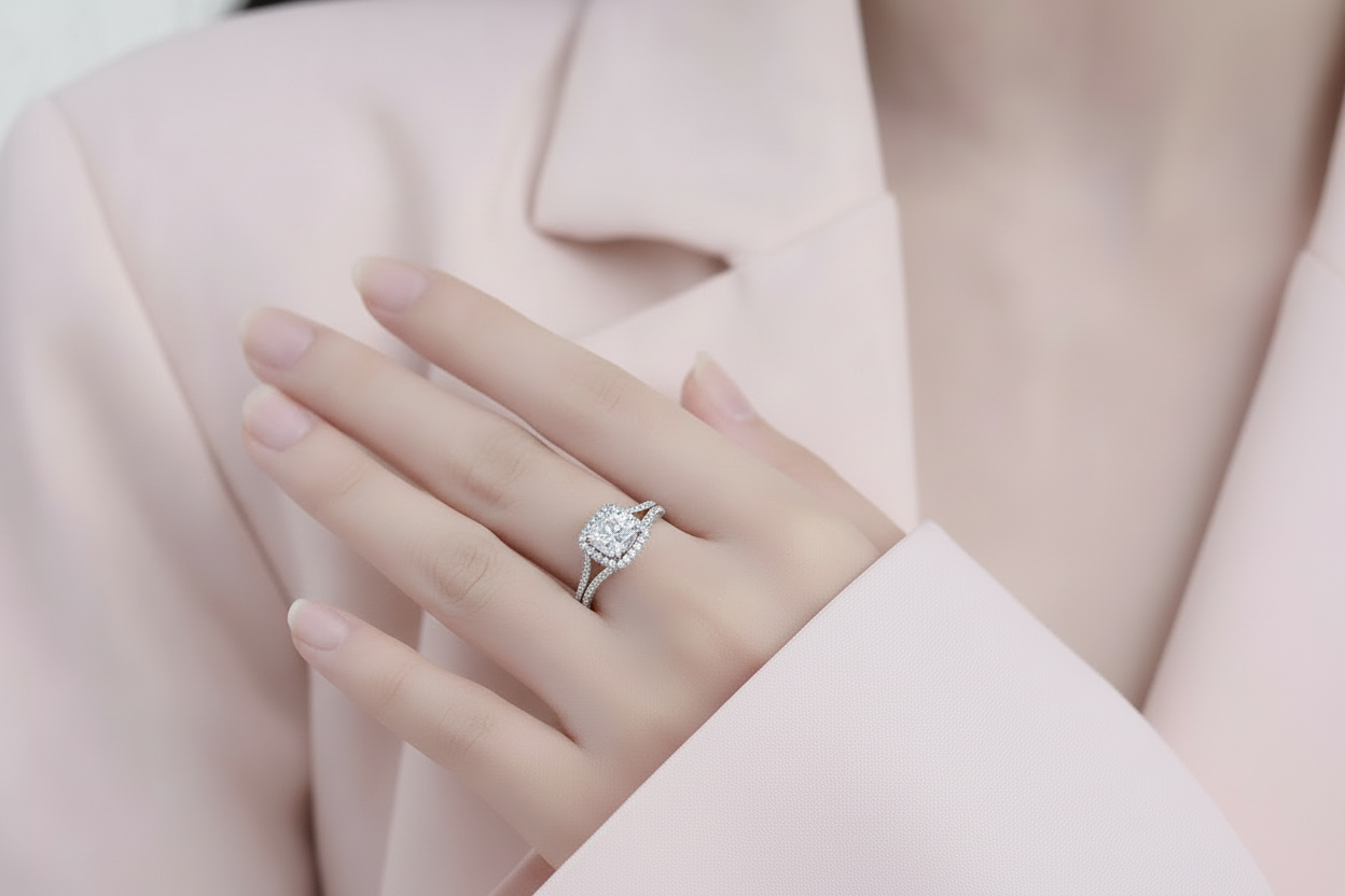 Bague en argent avec moissanite central taille ronde, mise en valeur par un serti décoratif de forme carré et un anneau à branches croisées serties de moissanites scintillantes. Son design structuré et raffiné en fait une pièce d’exception, idéale pour les grandes occasions ou comme bijou signature. Un éclat souverain à porter avec élégance.