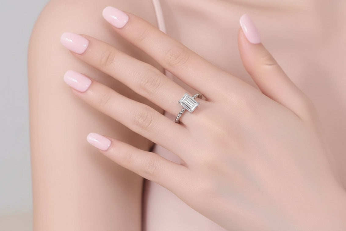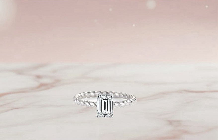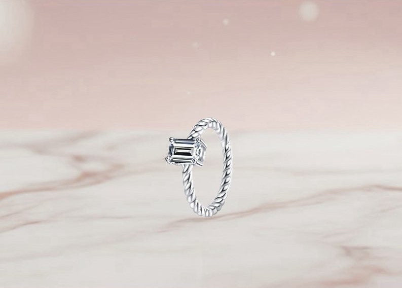 Bague en argent au design torsadé, sublimée par une moissanite centrale taille rectangulaire en serti griffes. Son anneau fin et sculpté apporte une touche moderne et raffinée. Un bijou lumineux et structuré, parfait pour les tenues épurées ou les instants précieux.