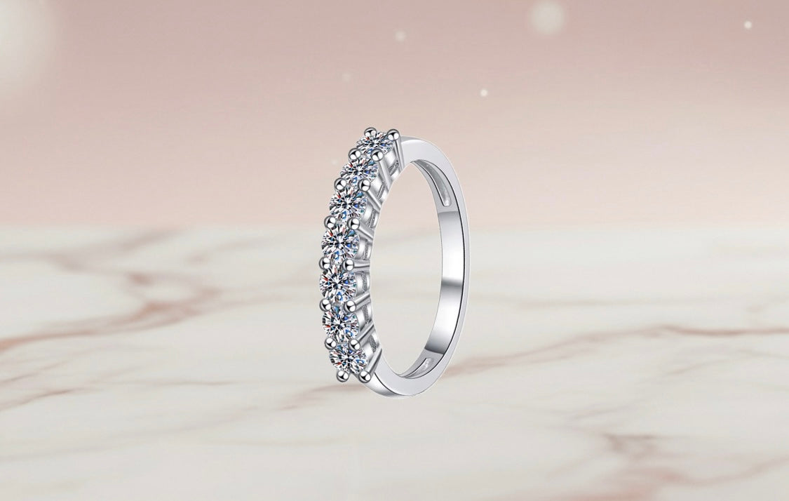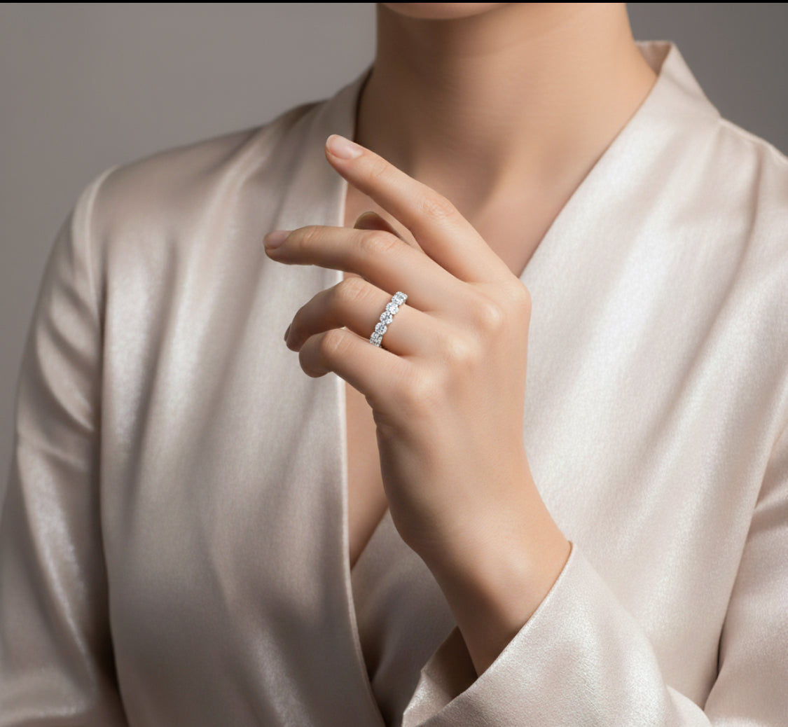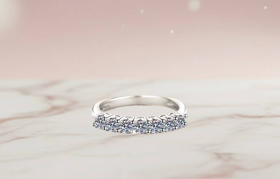 Cette alliance délicate et brillante est confectionnée en argent massif S925 rhodié, garantissant un éclat durable et une résistance à l'épreuve du temps. Son design raffiné présente une ligne continue de moissanite cubiques de qualité supérieure, chacun minutieusement serti pour maximiser sa brillance.