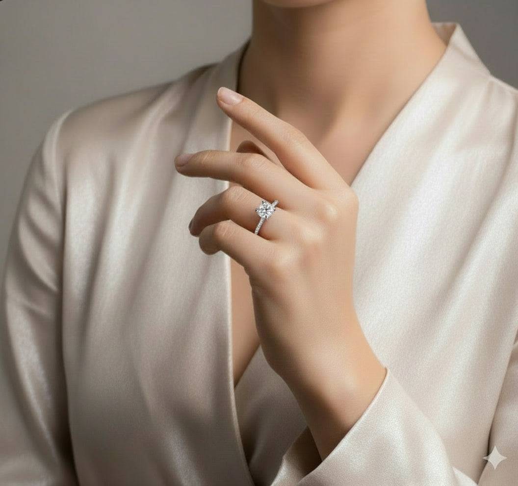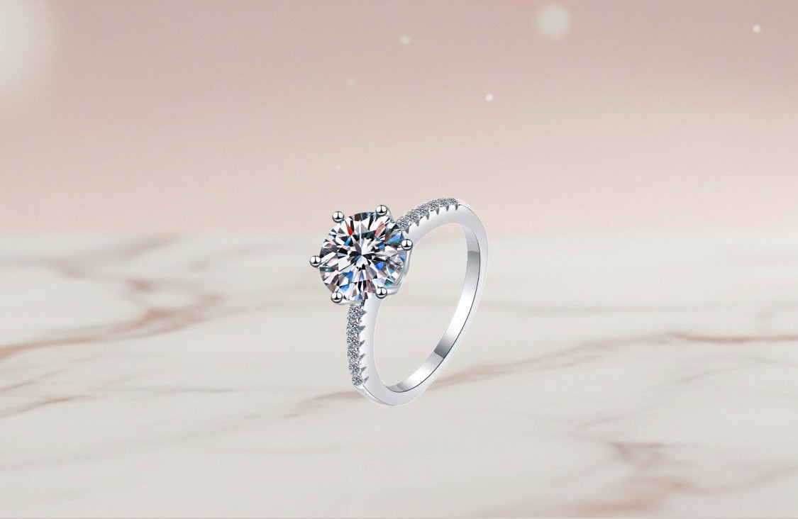 Cette bague est l'incarnation de l'élégance et du romantisme. Elle met en valeur une moissanite centrale d'une brillance spectaculaire, fermement maintenue par un sertissage emblématique à six griffes. L'anneau, réalisé en Argent Massif S925, est sublimé par un délicat pavage de pierres d'accent en moissanite qui amplifie l'éclat général de la bague. C'est le choix parfait pour une bague de fiançailles, de promesse ou un cadeau inoubliable.
