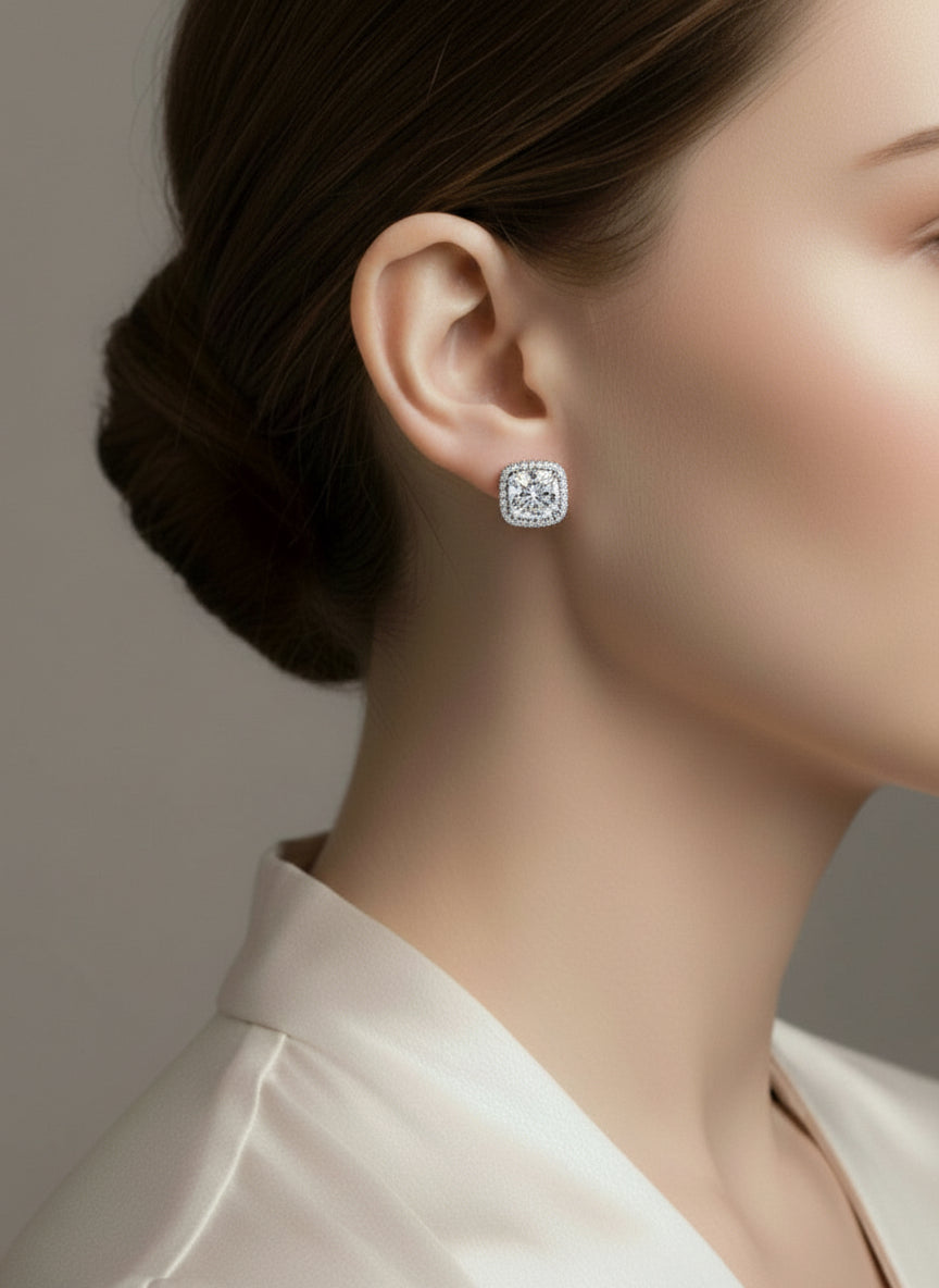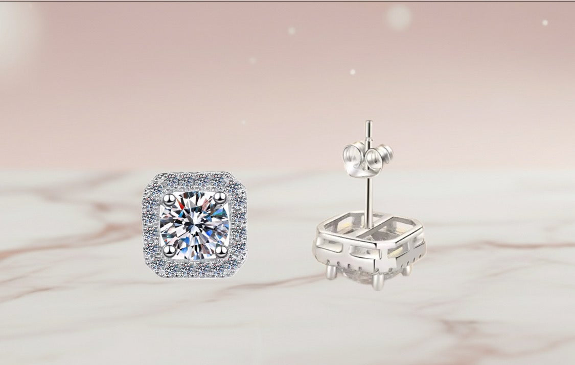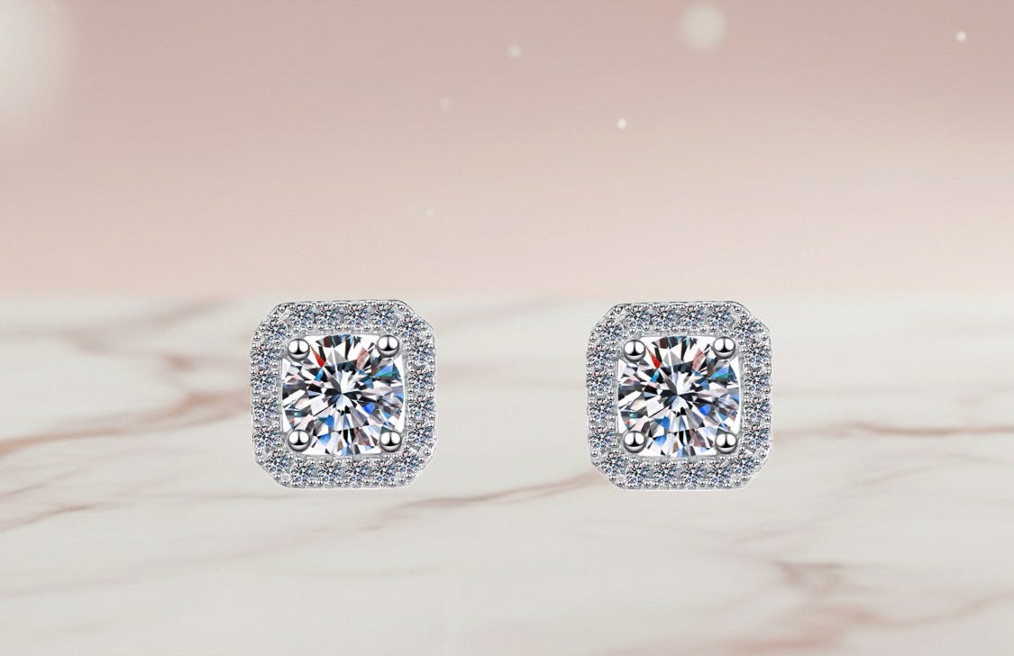 Ces magnifiques boucles d'oreilles clous incarnent l'élégance intemporelle et le glamour. Elles se distinguent par un design "halo" où une moissanite centrale carrée est sublimée par un entourage étincelant de petites moissanite, créant un effet de brillance maximal. La monture en argent S925 assure une tenue solide et un éclat durable.