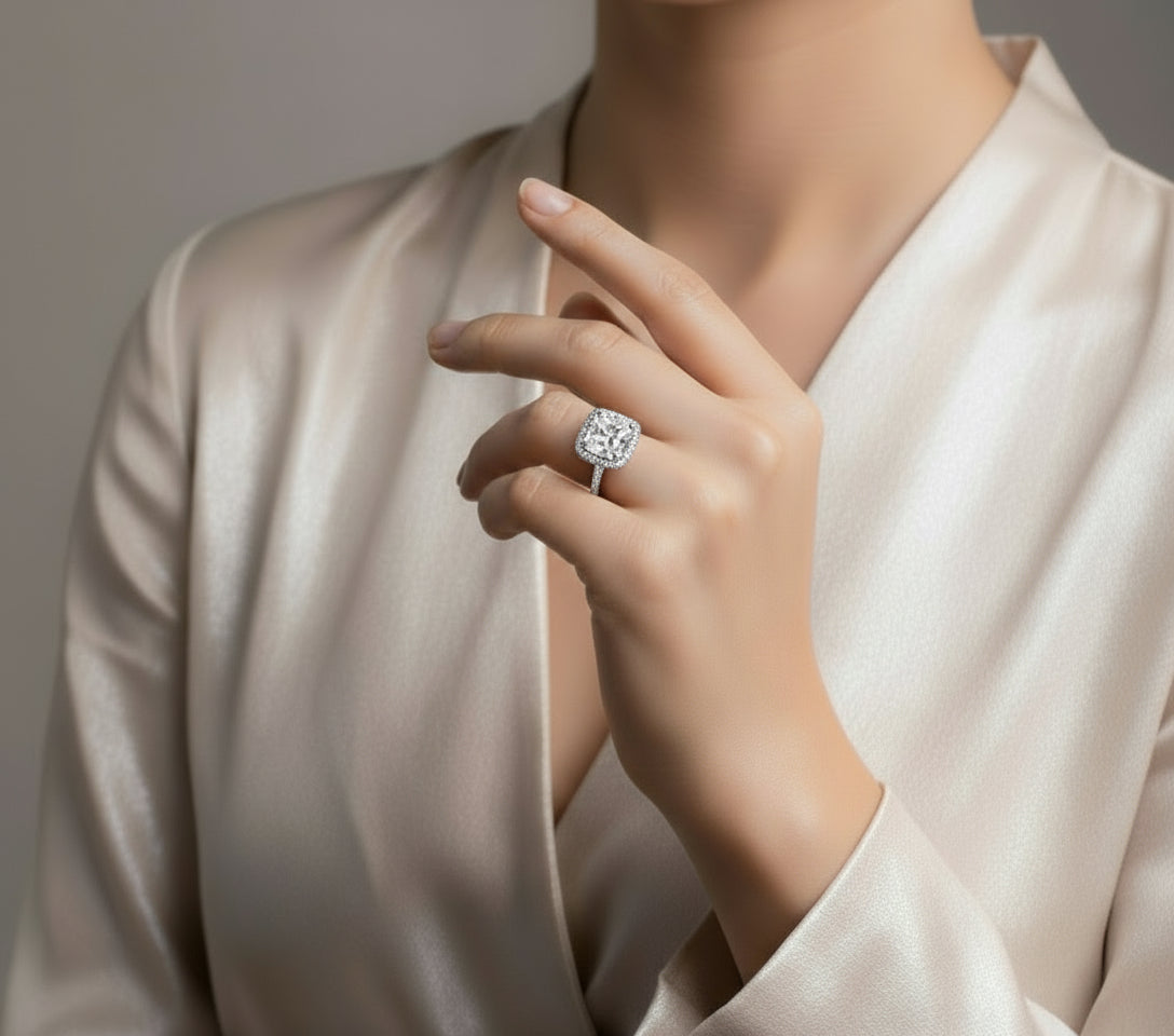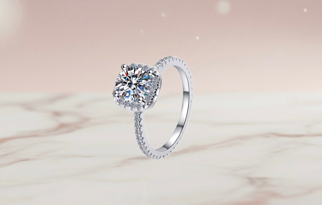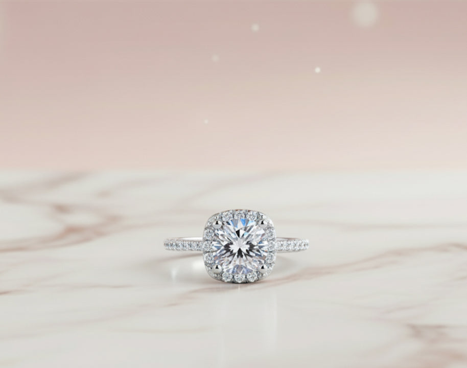Capturez l'essence de l'élégance avec cette magnifique bague solitaire en argent S925. La moissanite centrale taille coussin, d'une brillance exceptionnelle, est magnifiquement entourée d'un halo scintillant de petites moissanites, accentuant sa taille et son éclat. Le corps de l'anneau, délicatement pavé de moissanites, ajoute une touche de luxe et de sophistication.