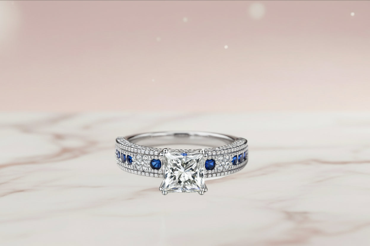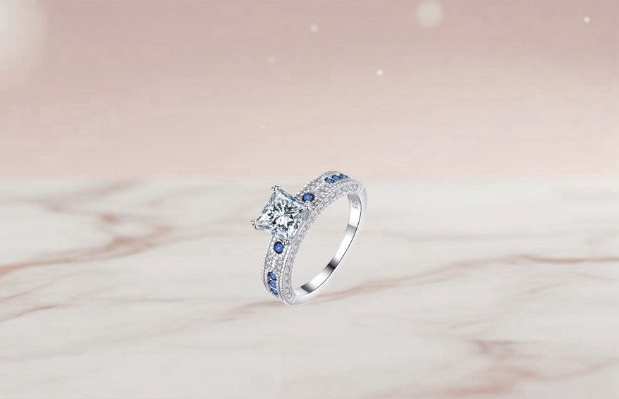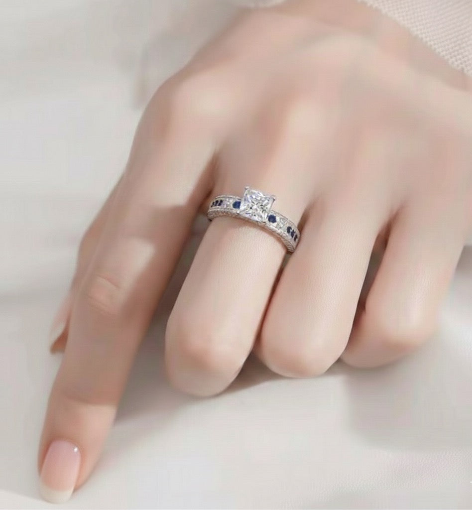 Bague en argent élégante avec une moissanite central taille ronde, sublimée par des moissanites bleues serties sur l’anneau pour un contraste raffiné. Son design lumineux et sophistiqué en fait un bijou idéal pour les occasions spéciales ou les cadeaux précieux. Un éclat intemporel à porter au quotidien ou pour marquer les instants uniques.