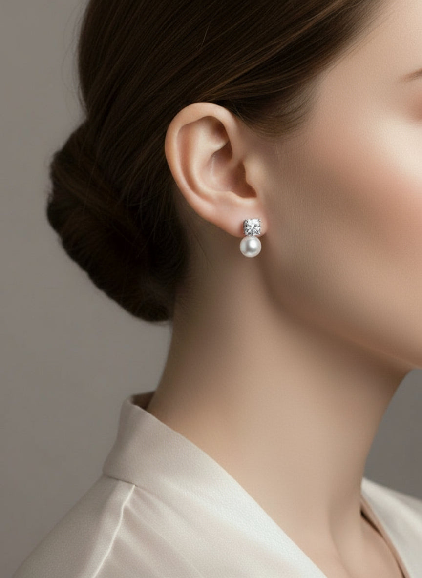 Chaque boucle d'oreille présente une perle d’eau douce délicate et parfaitement ronde, d'un blanc nacré irisé, suspendue avec grâce sous une moissanite solitaire taillé avec précision. La moissanite, serti dans un argent massif S925 rhodié, capture et reflète la lumière avec un éclat comparable à celui d'un diamant, apportant une touche de glamour subtil.
