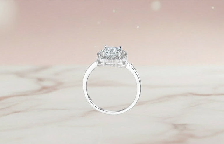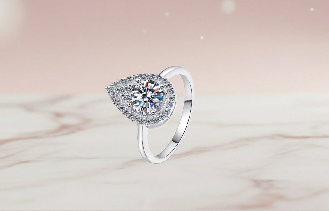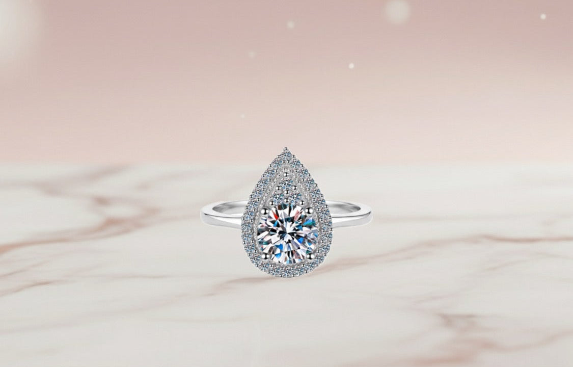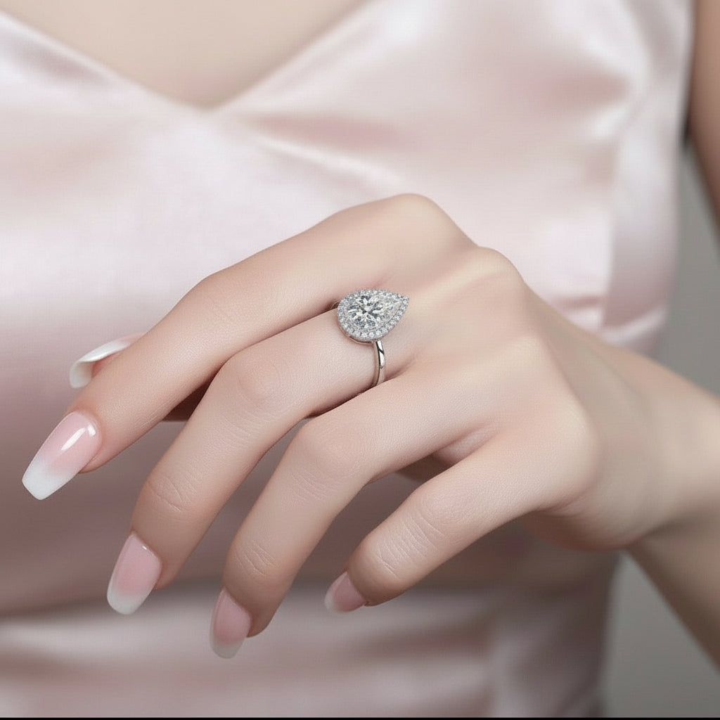 Cette bague met en scène une moissanite centrale en taille goutte d'eau rappelant une goutte de rosée matinale. Cette moissanite est délicatement entourée d'un double halo de petites moissanites étincelants, qui amplifient son éclat et soulignent sa forme distinctive. Le corps de l’anneau en argent S925, est lisse et épuré, offrant un contraste parfait qui met en lumière la splendeur du centre.