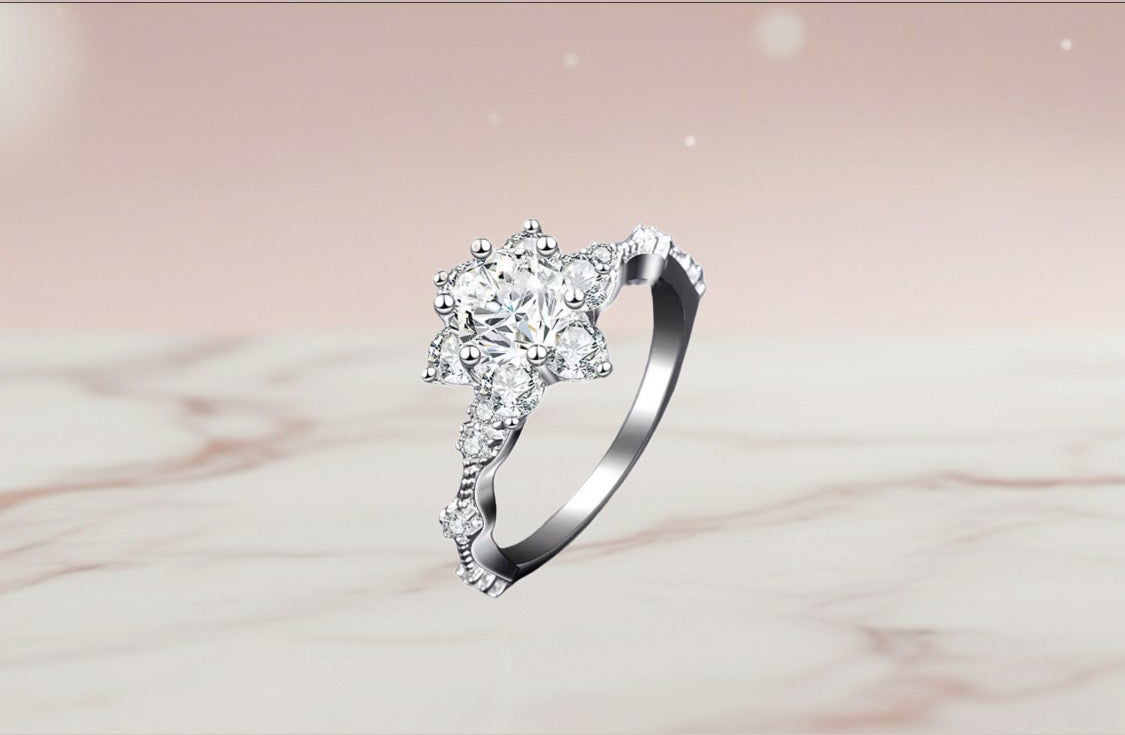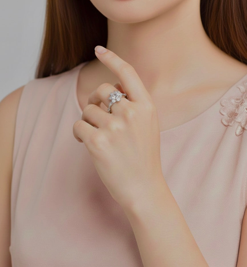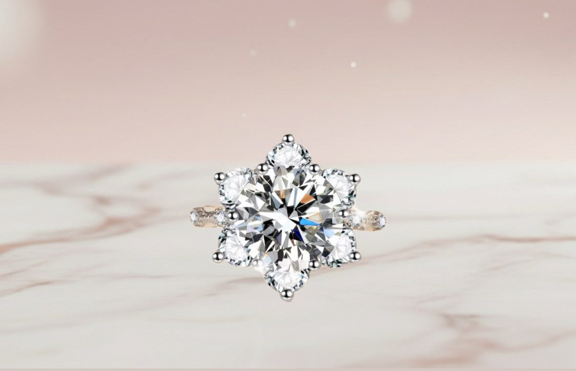 Cette bague magnifique présente un cluster central de moissanite brillantes serties en forme de fleur. Cette monture audacieuse maximise la brillance et l'impact visuel, donnant l'illusion d'un très gros diamant. Le jonc est finement orné de moissanites secondaires, ajoutant une touche de finesse et de lumière.