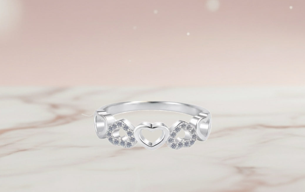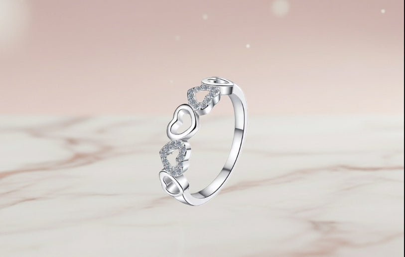 Bague romantique ornée d'une frise de cœurs. Elle alterne entre des motifs de cœurs évidés lisses et des cœurs délicatement pavés de petites moissanites brillantes. Son design fin et féminin en fait un bijou parfait pour symboliser l'affection.