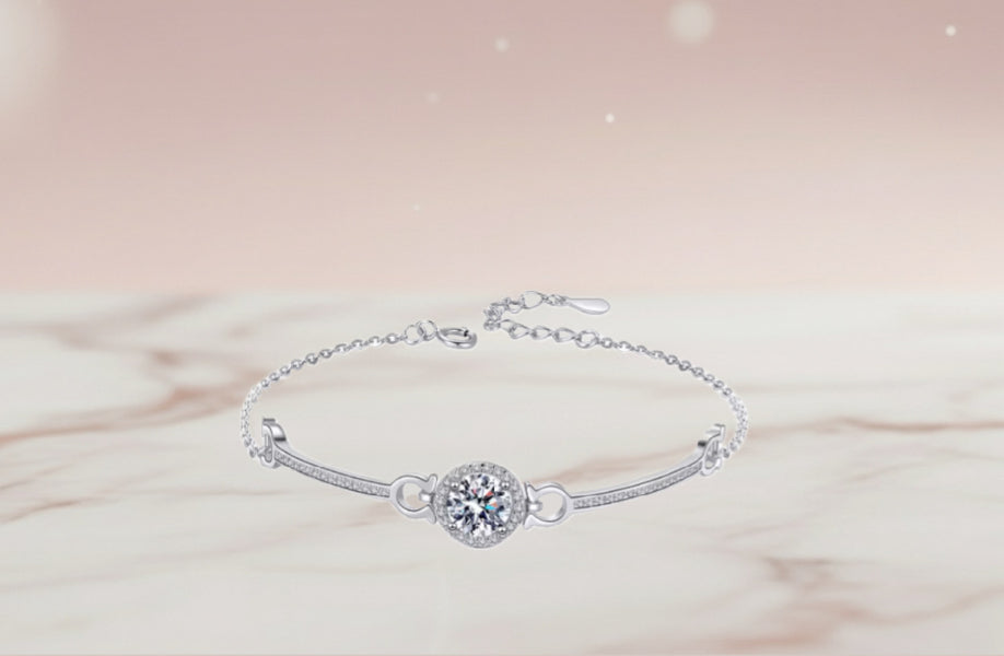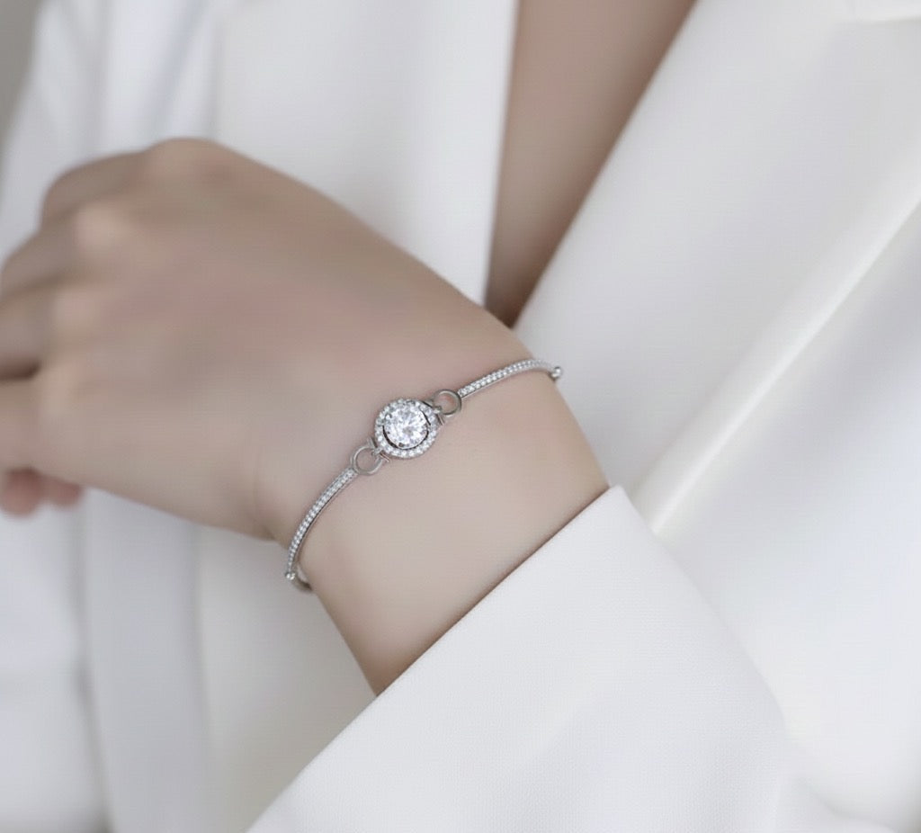 Bracelet en argent raffiné avec moissanite centrale taille ronde en serti halo, encadrée de segments courbés sertis. Sa chaîne fine et son fermoir ajustable offrent un porté confortable et élégant. Un bijou lumineux et sophistiqué, idéal pour les moments précieux ou les tenues habillées.
