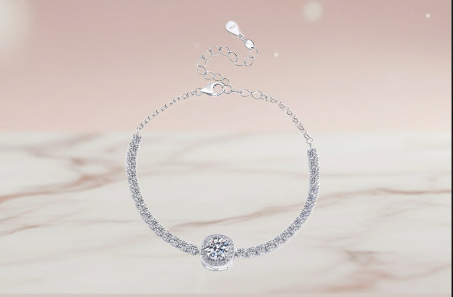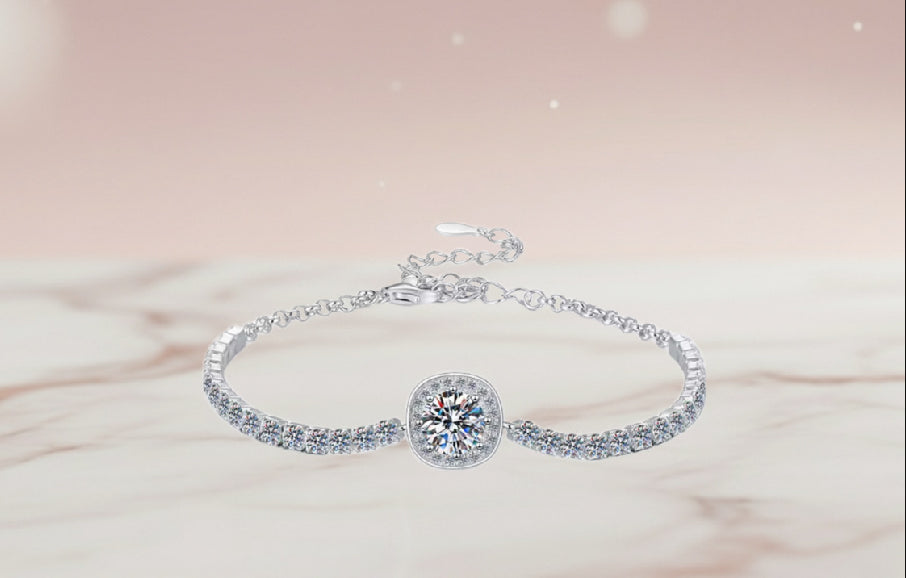 Bracelet en argent délicat, orné d’une série de moissanites scintillantes sur toute sa longueur et d’un centre lumineux avec moissanite taille ronde en serti halo. Sa chaîne fine et ajustable assure un confort élégant. Un bijou intemporel, parfait pour sublimer les tenues raffinées ou offrir un éclat précieux.