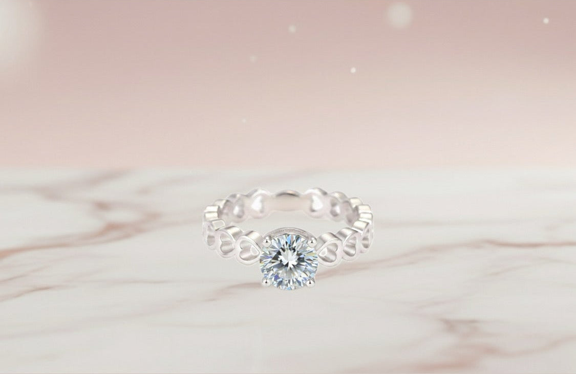Bague en argent avec moissanite centrale taille ronde en serti griffes, sublimée par un anneau orné de découpes en forme de cœur. Son design raffiné et symbolique en fait un bijou idéal pour les déclarations d’amour ou les occasions précieuses. Un éclat tendre à porter au quotidien ou pour marquer un moment unique.