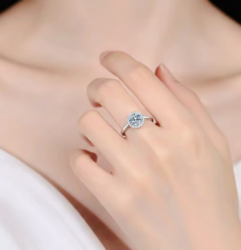 Cette élégante bague solitaire présente une magnifique moissanite centrale ronde, sertie avec précision, et entourée d'un délicat halo de petites moissanite qui évoquent une fleur en pleine éclosion. Le corps de la bague en argent S925 poli complète harmonieusement l'ensemble, offrant un design raffiné et intemporel.