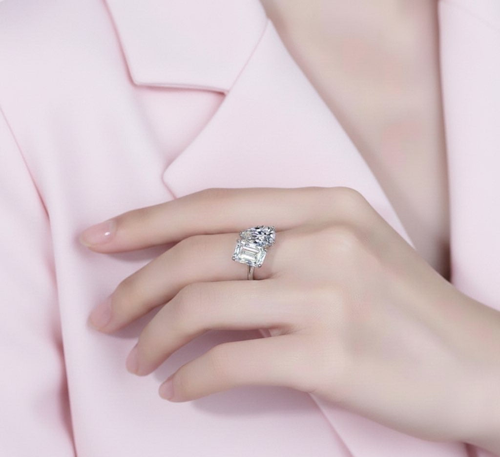 Affirmez votre style avec cette bague audacieuse au design "Toi et Moi". Mariage parfait entre une moissanite taille Poire et une moissanite taille Émeraude, ce bijou capte la lumière sous tous les angles pour un éclat irrésistible. Sophistiquée et moderne, sa monture en argent S925, épurée souligne avec grâce l'éclat de ses deux pierres emblématiques. Un classique revisité, idéal pour sublimer vos tenues ou célébrer une union unique.